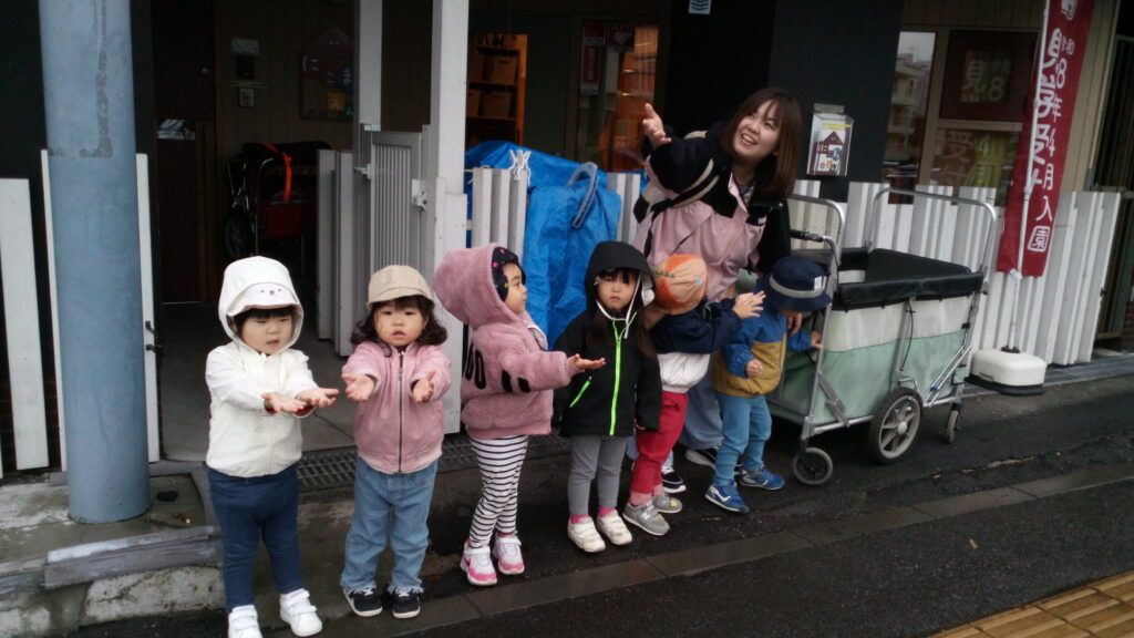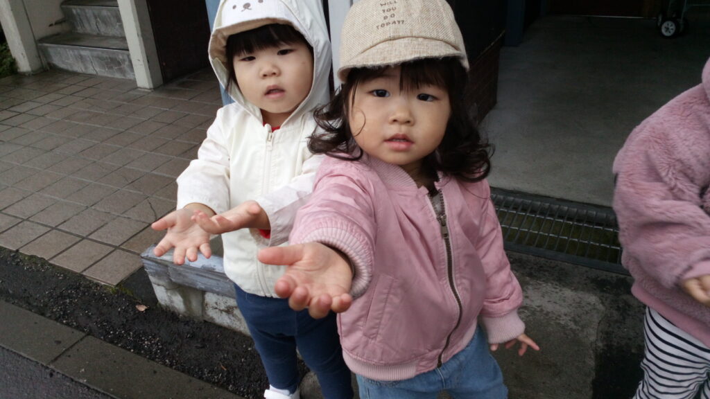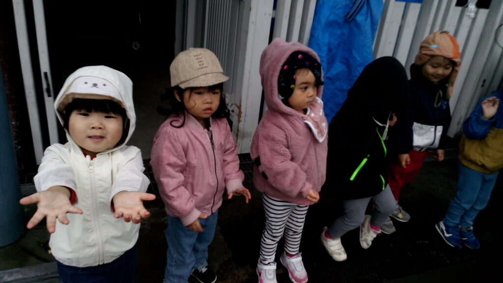 「さあ公園にいこう!」とお外に出た途端ザーッと雨が(>_<)「公園にいけないね。」としょんぼりしている子どもたちに先生が「濡れてもいいから雨触ってごらん。」と声をかけてみました。すると「わー✨」「つめたいね」と大喜び!!かわいい手のひらを広げて雨の感触を楽しんでいました♪