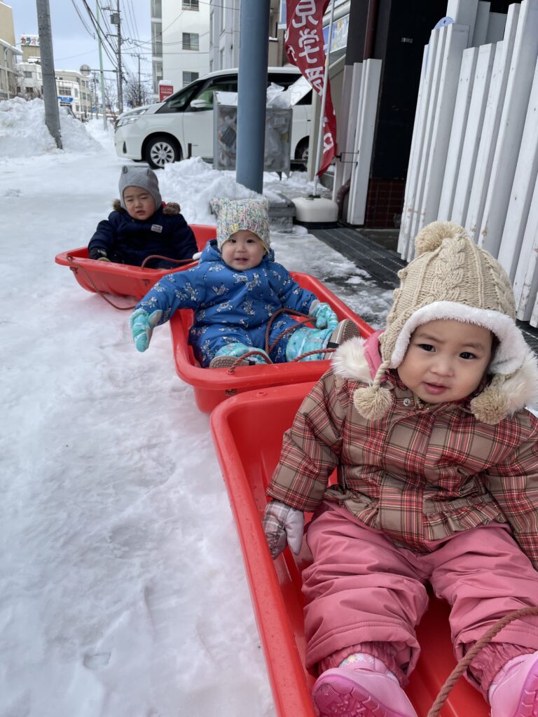 0歳児さん初めてソリに乗ってみました!泣きもせずじっとソリにのって他のお友だちが来るのを待っている姿をパチリ♪後からきた1歳児のお姉さんたちがしっかりと後ろを支えてくれましたよ!