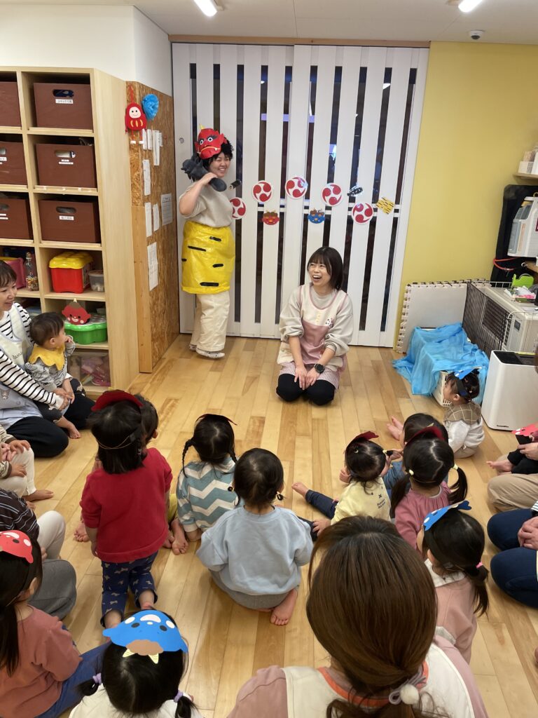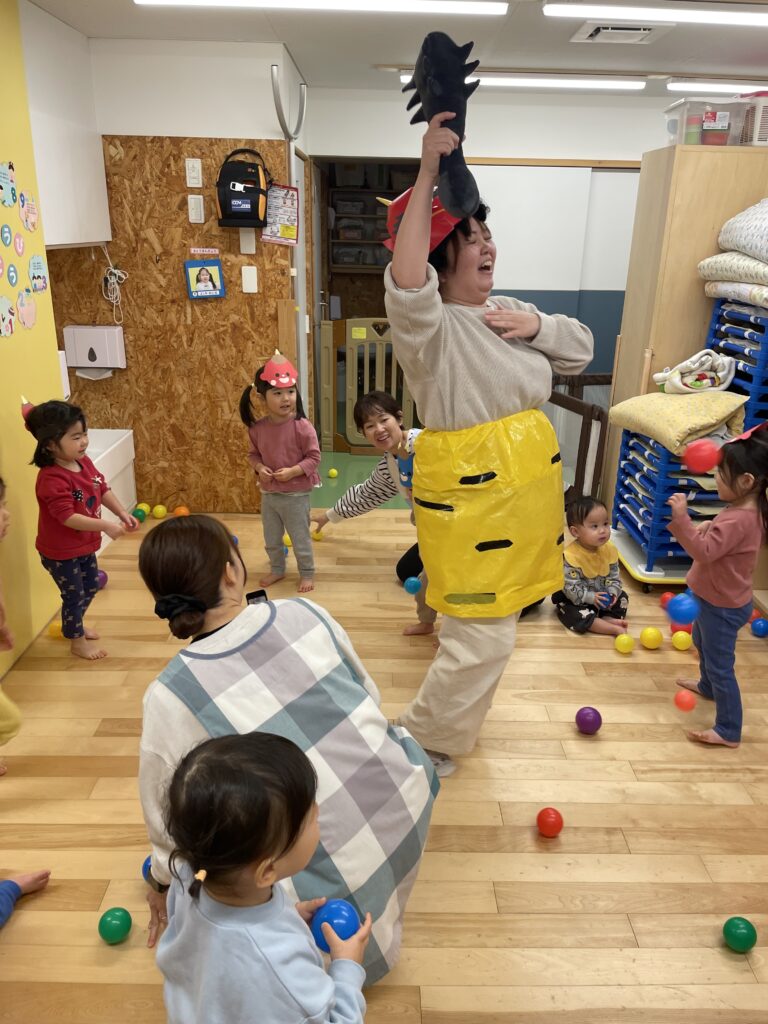 「心の豊かさとはなんだ。」とCMのパロディから始まった今年の節分。みんなが大好きな先生が鬼になって登場しました(^-^)お友だちに優しくすること、みんなと一緒に楽しい気持ちになることそれが心の豊かさということで鬼さんとダンスをして豆まきをしました♪最後はピンポーン!と春のお届け。壁にお花を貼って「春よこいー!福よこいー!」と願いを込めました。にこまるえん南郷のみんなに福がきますように(^^)