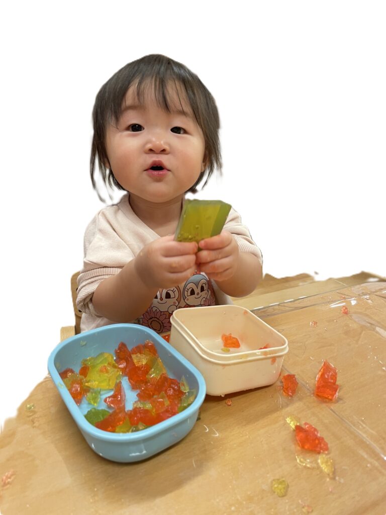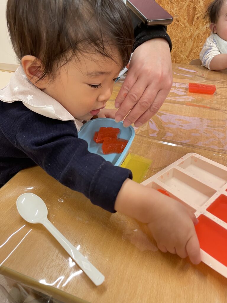 今日は風が強くて外に出られないので寒天ゼリーであそんでみました(*^-^*)指でさしたり、握ってぐちゃぐちゃにしてみたり、お弁当箱に入れたり0歳児さんでも楽しむことができました♪終わった後の寒天が紅葉のようでとてもきれいでした( *´艸`)