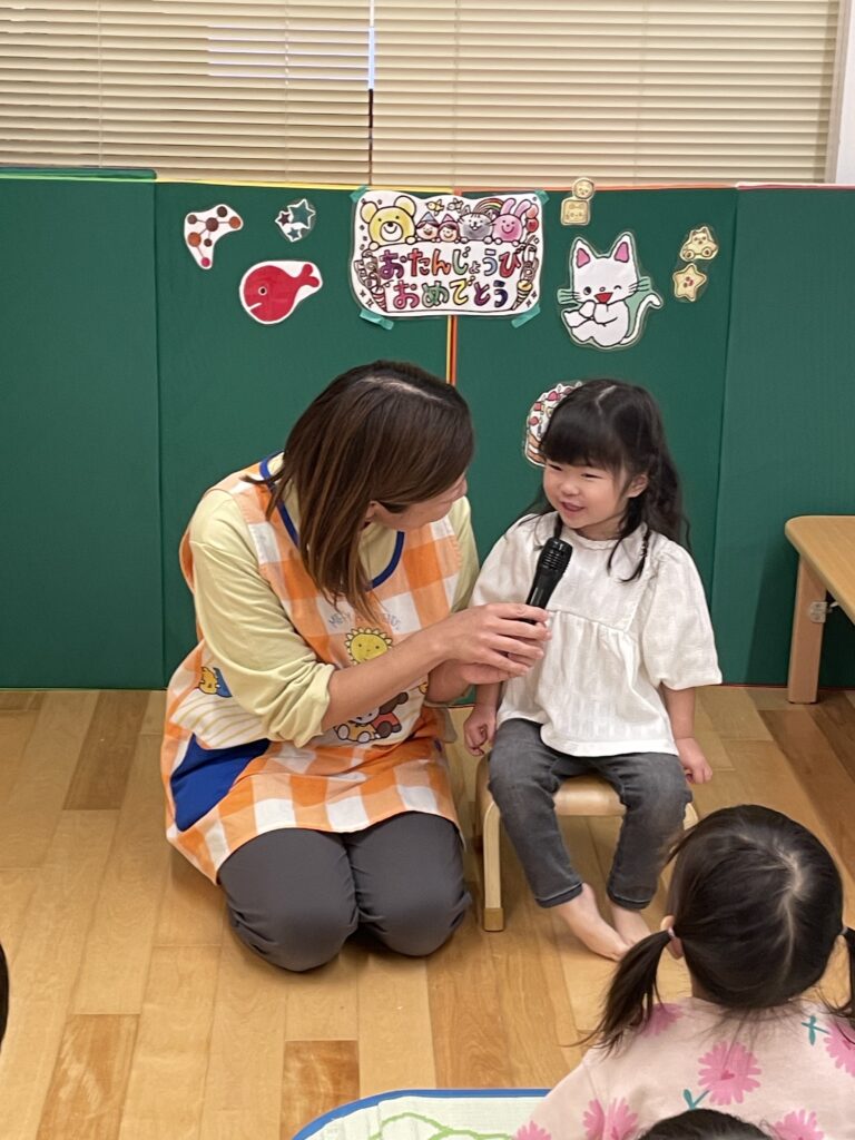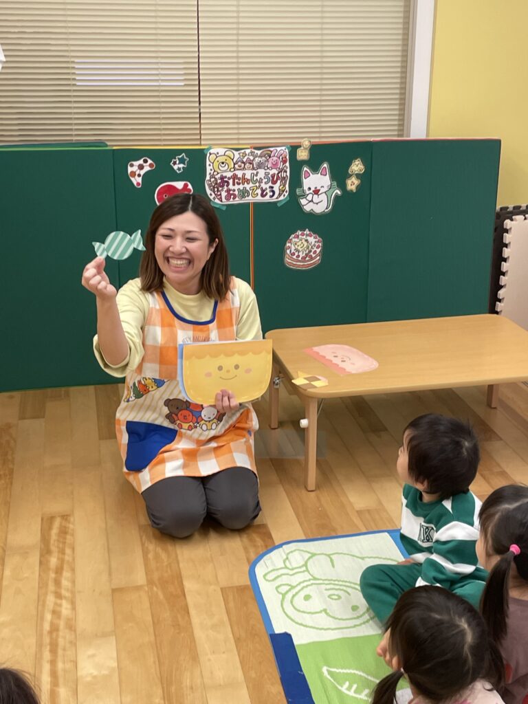 先月欠席でお誕生会ができなかったお友だちをみんなでお祝いしました(*^-^*)とっても上手にインタビューに答えられていて「おー!」と歓声が上がっていましたよ!先生からの出し物は「ふしぎなポケット♪」でした。次々にお菓子が出てくるポケットにみんな喜んで見ていました( *´艸`)