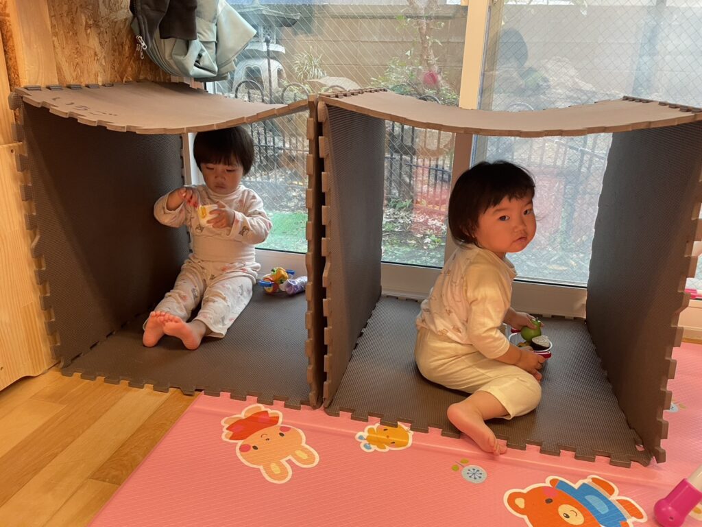 保育士がお部屋の一角にちょっとした屋根のあるお家をつくると大喜び!!