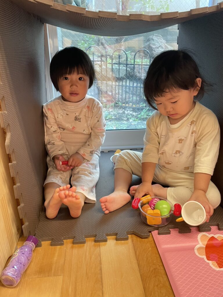 最初はお隣さん同士で遊んでましたが、気付けば同じお家に一緒に入ってごっこあそび!とても楽しんでました。