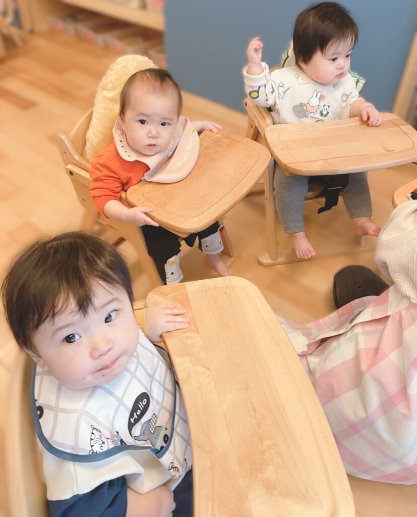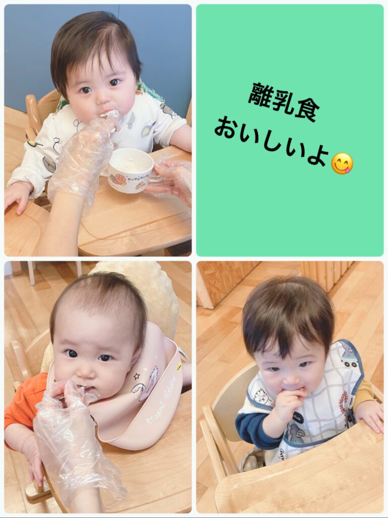 みんな仲良く離乳食を食べています♡~いちご組(0歳児)~