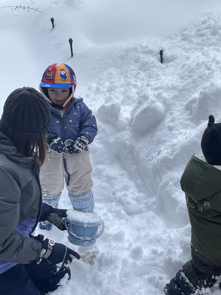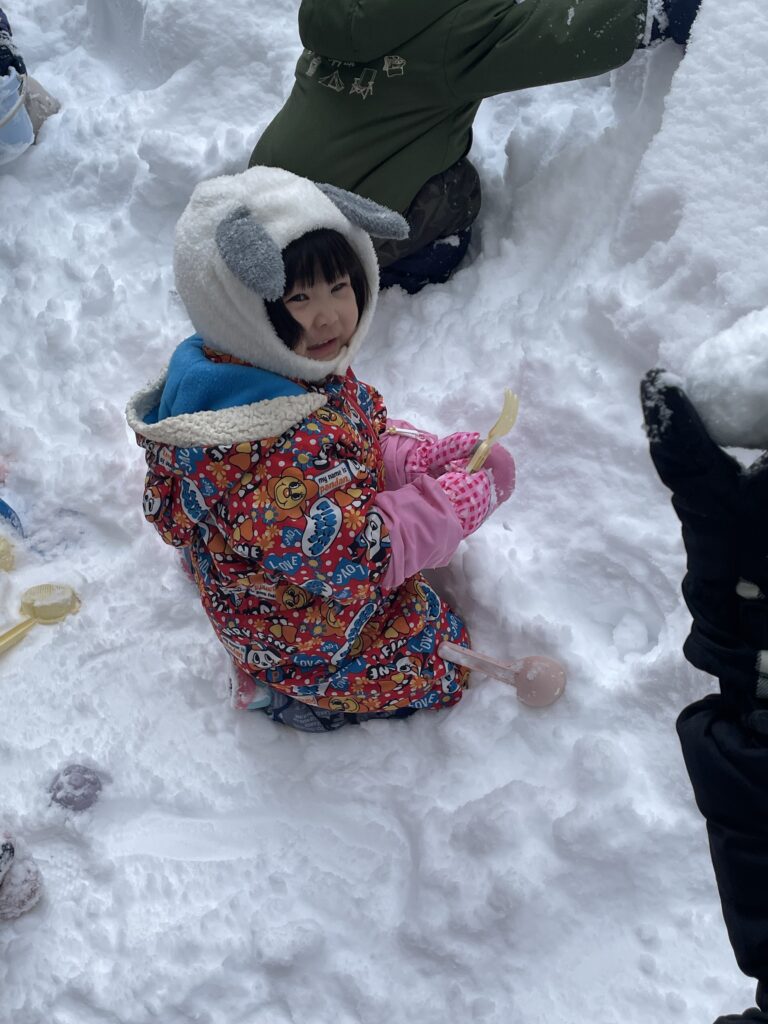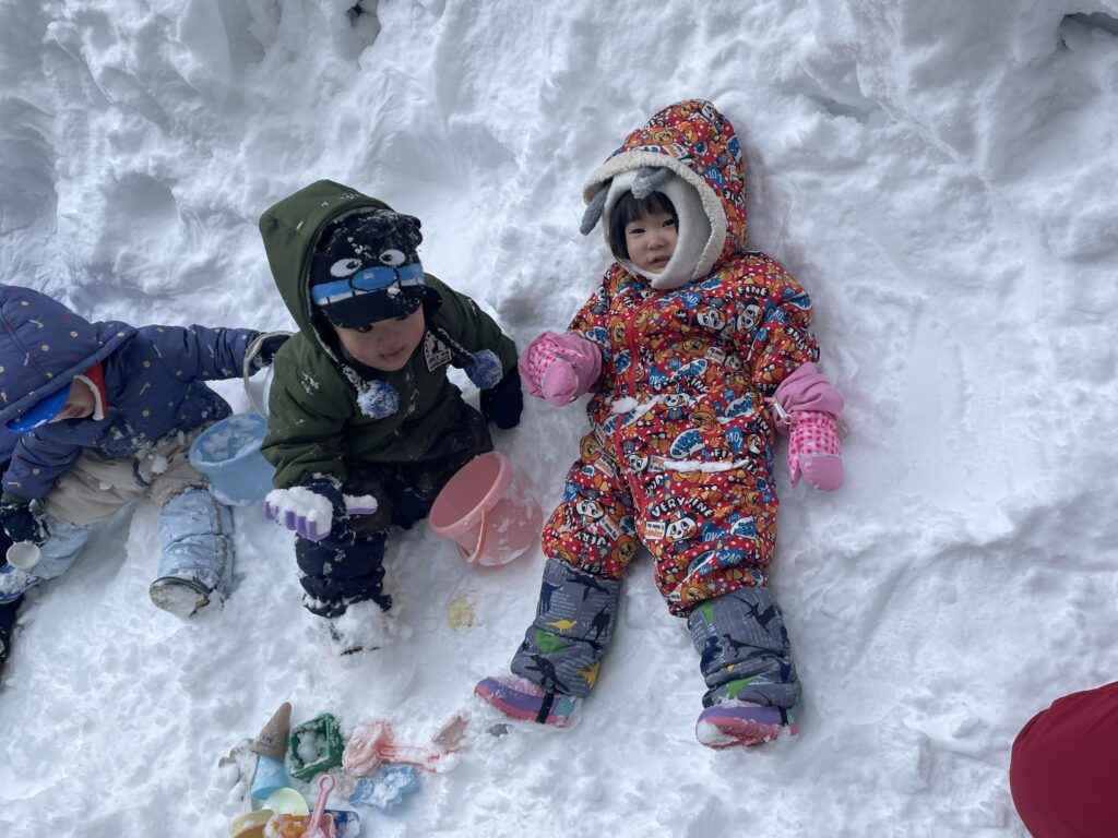 お友だちと一緒に雪のベッドに寝転がったり、「えいっ!!」と雪を飛ばして先生と雪合戦をしたり、バケツに雪を集めてみたり…それぞれ雪あそびをたっぷり楽しみました!