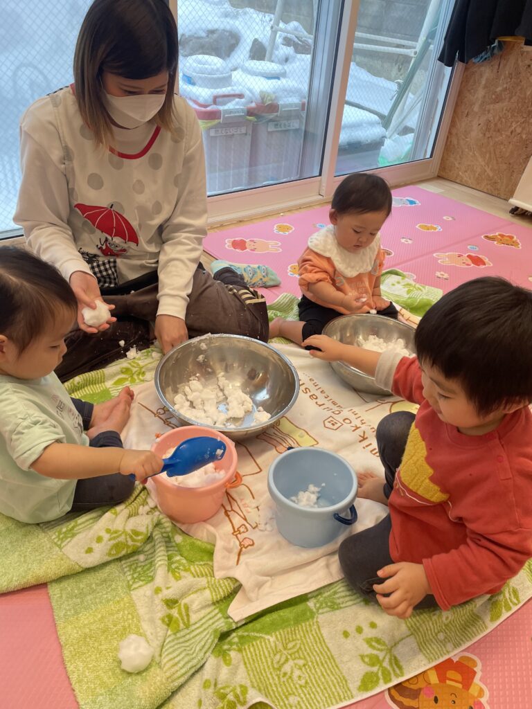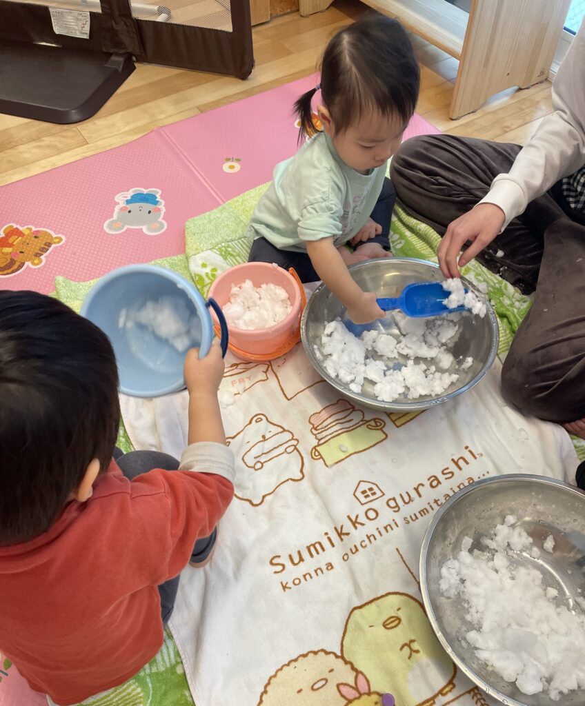 今年もついに雪が積もりましたね。小さいお友だちは初の雪あそび!お部屋の中に雪を持ってきて雪に触れてみることにしました!雪を直接にぎにぎしてみたり、シャベルですくってみたりしながら感触を楽しんでいましたよ。この日はももぐみの雪あそび上級者くんも一緒にあそんでくれました!