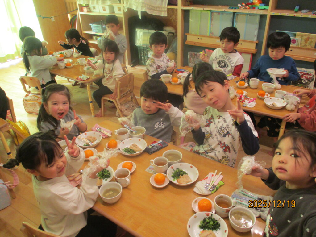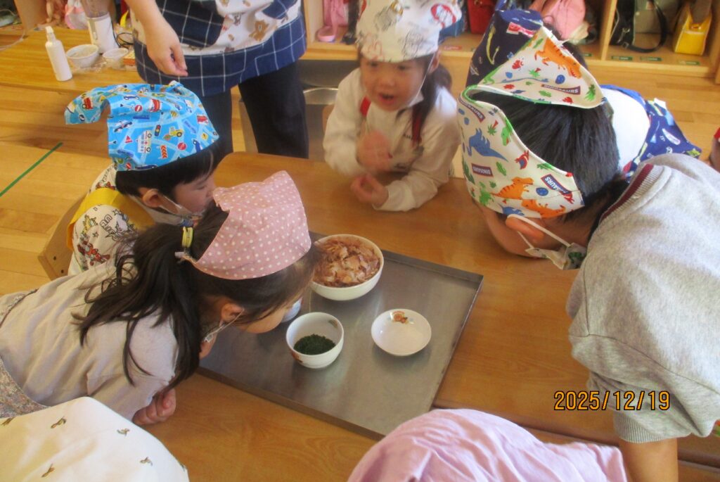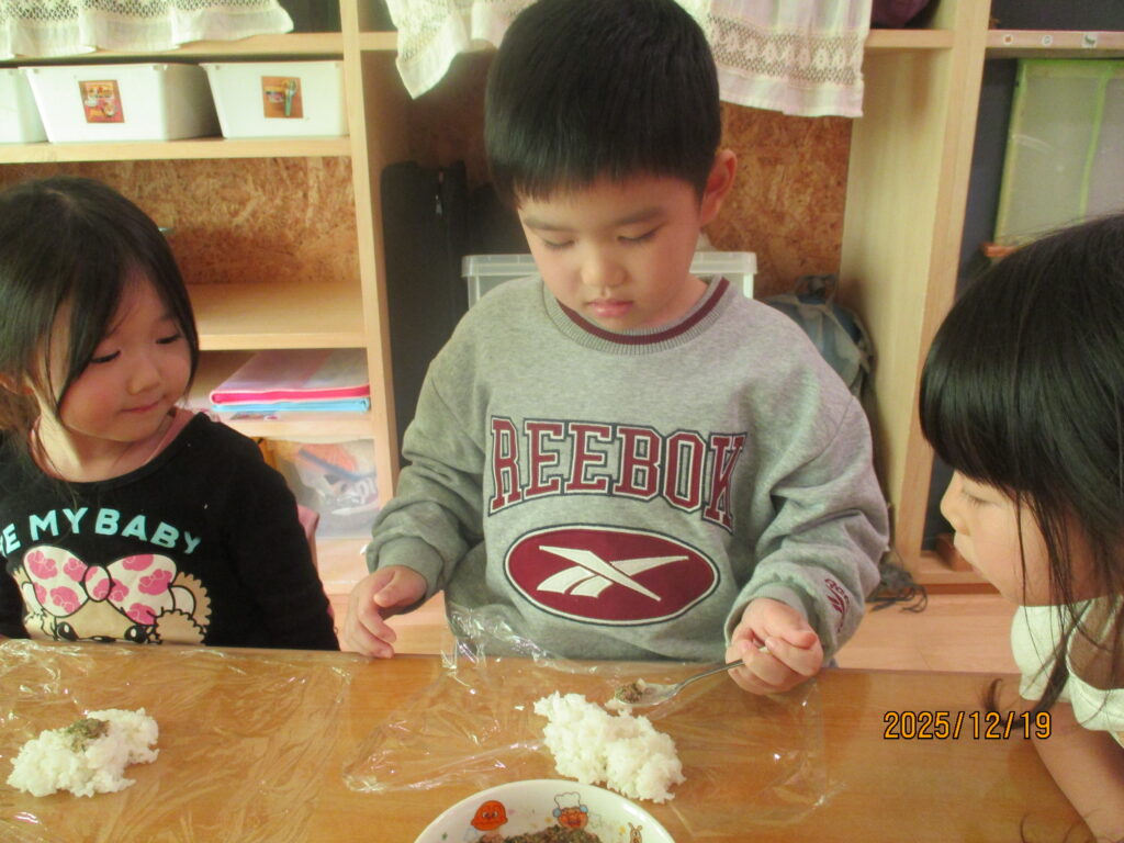大きなボールでお米を研ぎ、炊飯している間に、手作りのふりかけも作りましたよ♪作りてたのふりかけをかけ、それぞれ自分だけのおにぎりを作りました!!モリモリ、おかわりしているお友だちも多かったです♪