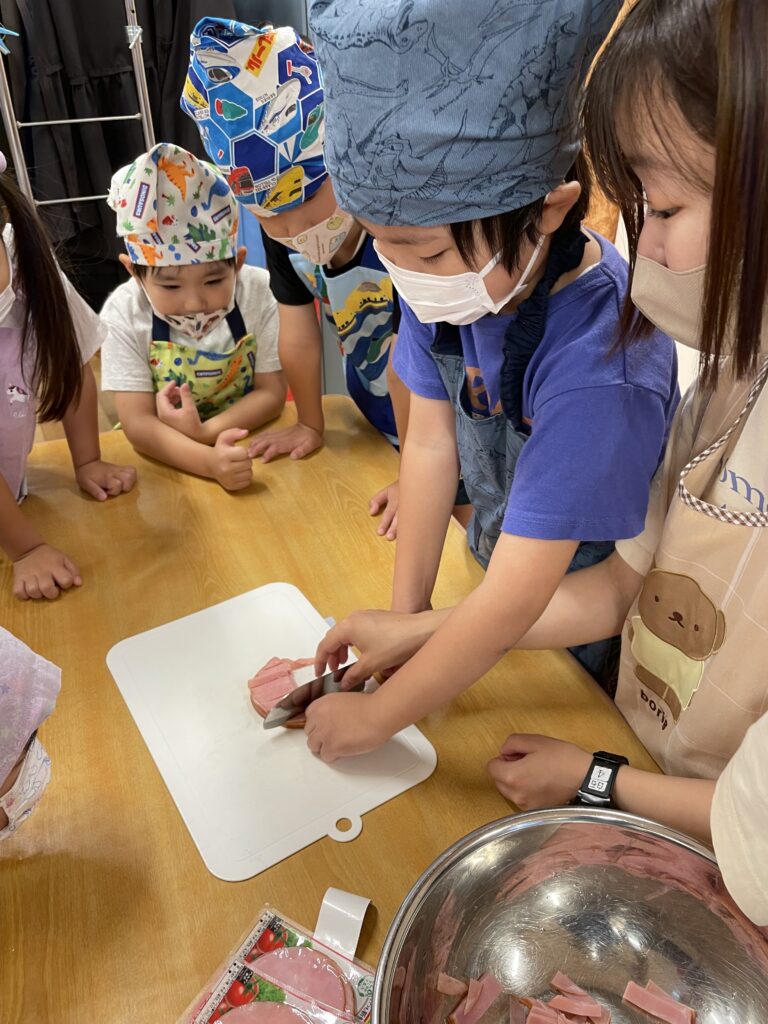 5歳児クラスは、包丁に挑戦♪ハムを切ってもらいました!!
