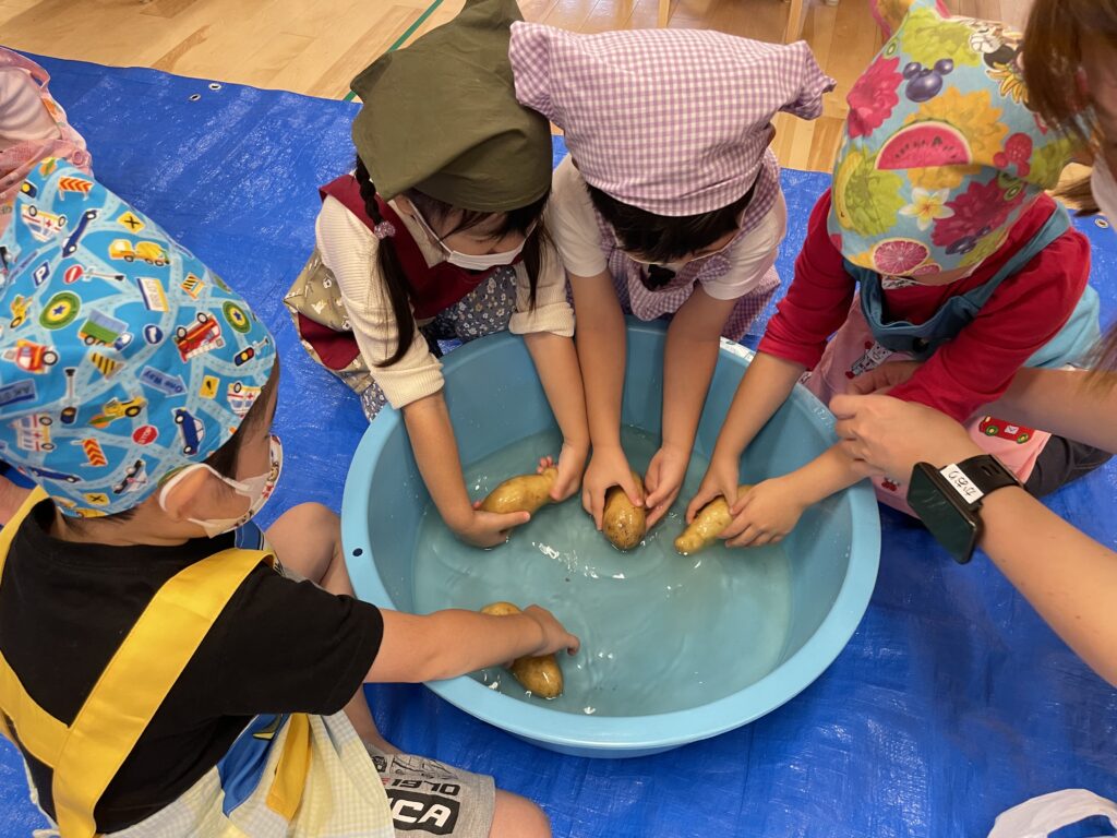 3・4歳児クラスはタライのお水でイモ洗いをしてもらいました。