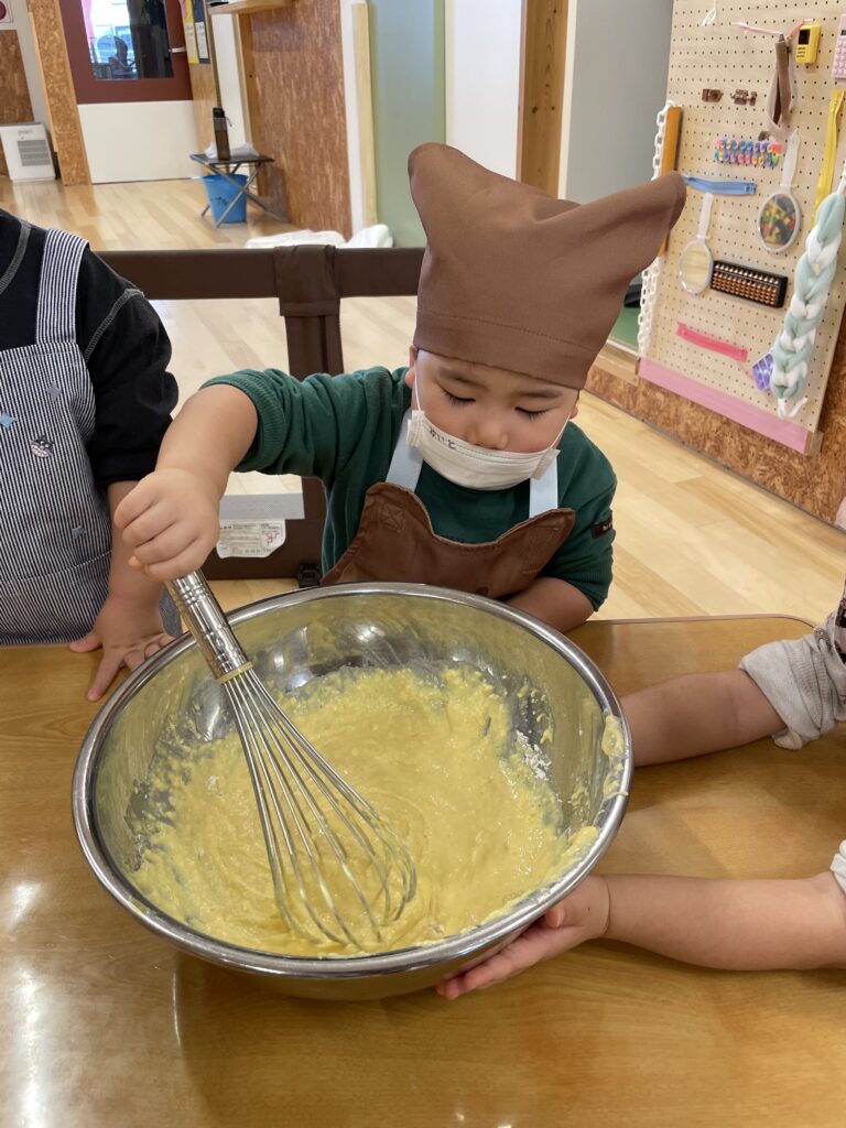 自分たちで材料をボールに入れ、泡だて器で上手に混ぜ、担任と一緒にホットプレートにも流し込みました!!