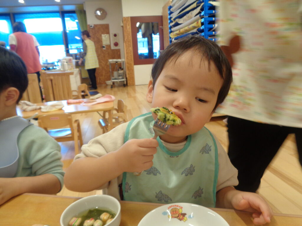 じゃがいもとほうれん草のおやきと、かぼちゃのおやきの2種類を作りましたよ!野菜の香りを楽しんだり、みんなで潰して丸めたり、とても楽しんでいました♪