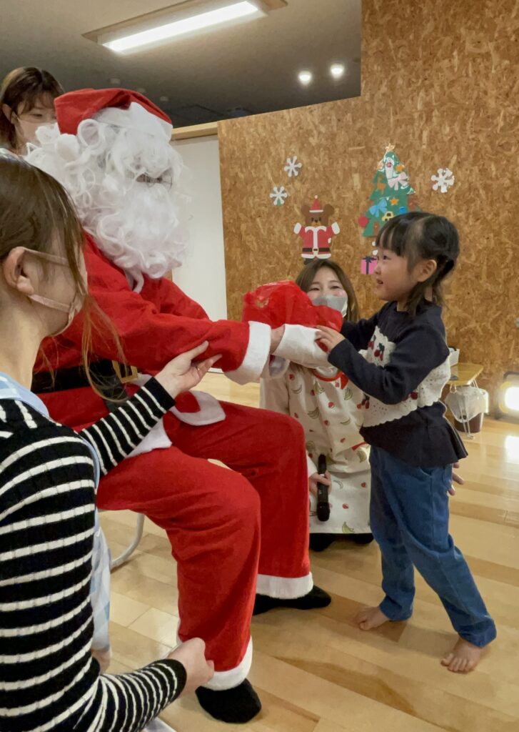 インタビューをしたり、一人一人プレゼントをもらい大喜びの子どもたちでした!クリスマスメニューもおやつのケーキの飾りつけも楽しみ、みんなの笑顔がキラキラ輝いていた1日となりました★