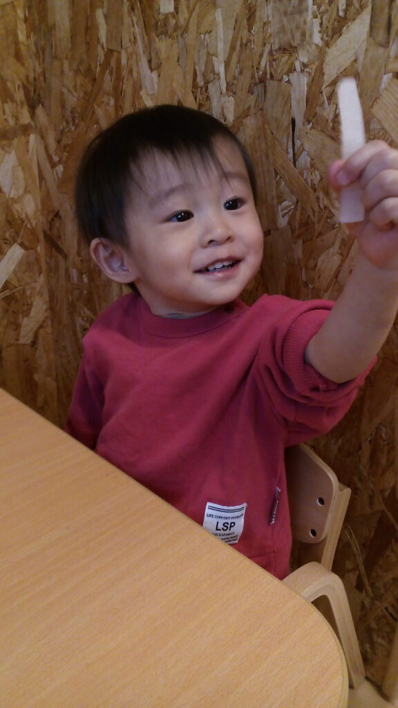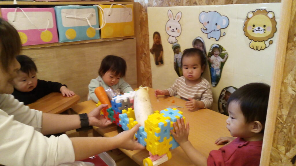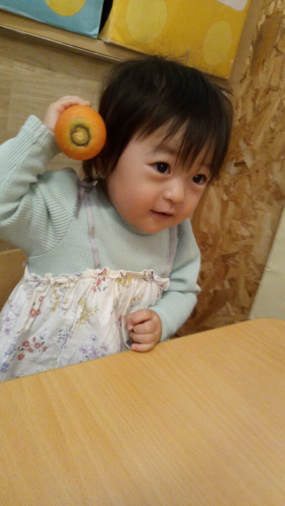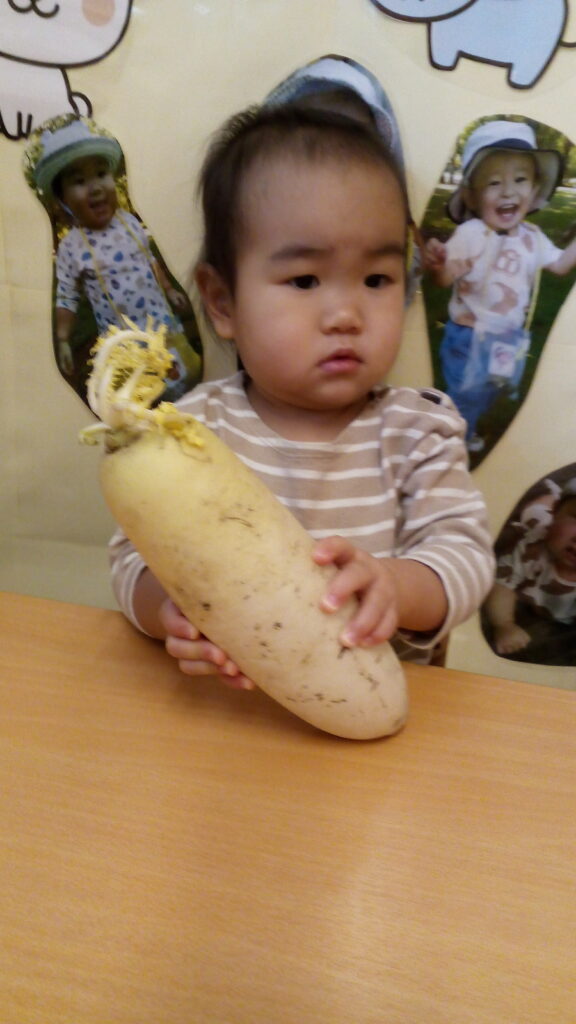 この日は食育活動の一環で、大根・人参・ごぼうに触れてみました‼普段は美味しい給食となって出てくる馴染みのある野菜も、生のお野菜にはみんな興味津々…。一人ひとり重さを確かめたり、テーブルにバンバンと叩きつけて固さを感じたり、匂いでも感じ取ってみましたよ。たくさん触って感触を感じた後には、特別にスティック状に切って茹でてもらったお野菜をかじって実食!興味を持った勢いで普段は好き嫌いのあるお友だちもすすんで食べていたり、もっとちょうだいと手をのばす子も。今回触ってみた野菜たちは給食で美味しい根菜カレーとなり、また子どもたちの元へ…。五感を働かせてとってもいい食育活動になりました。