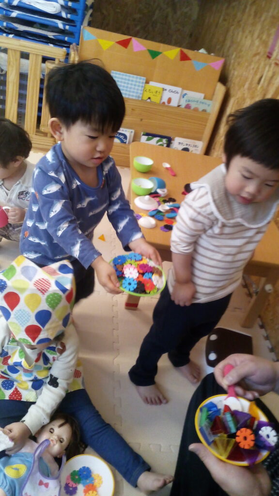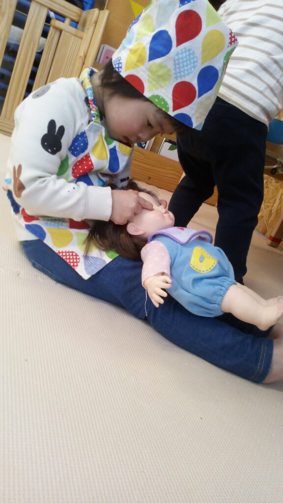 エプロンや三角巾を付けてお母さんに変身して赤ちゃんを寝かしつけをしたり、料理を作ってコックさんに変身したさくらんぼさん♪♪お母さんに変身すると「ねんねするよ~」「おむつかえよっか!」などなりきって楽しんでいましたよ!コックさんは「ごはんどうぞ~」と先生やお友だちにたくさんの料理を作ってくれていました☆