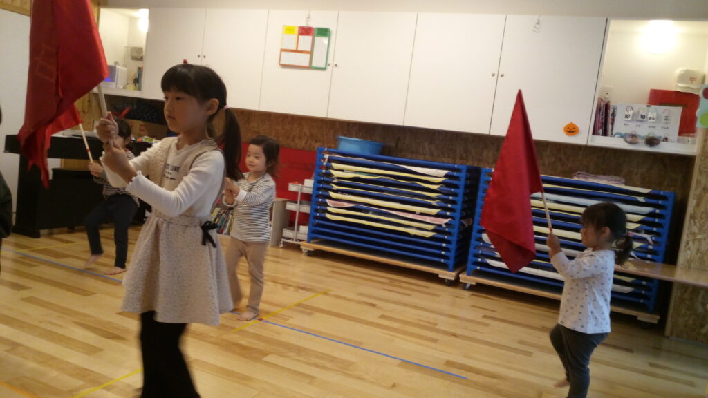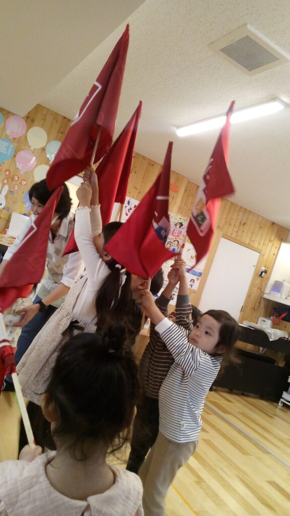 運動会も終わった次の週、お遊戯や玉入れなどを中心にみんなで運動会ごっこをしました。
