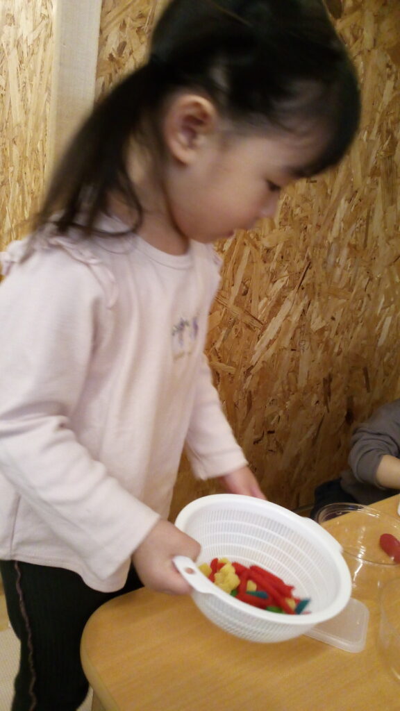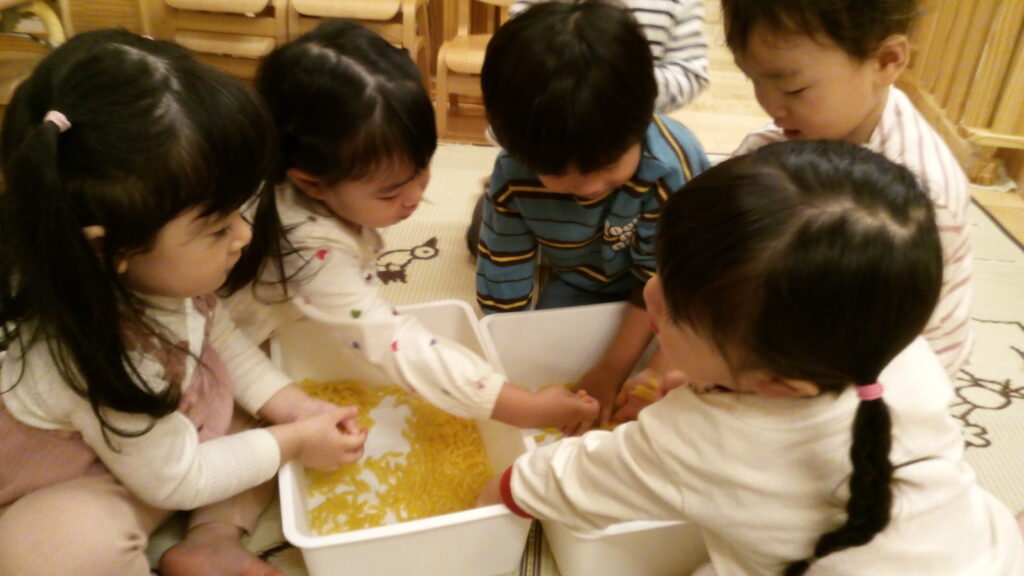 マカロニの感触あそびをしました~2歳児ももぐみ~