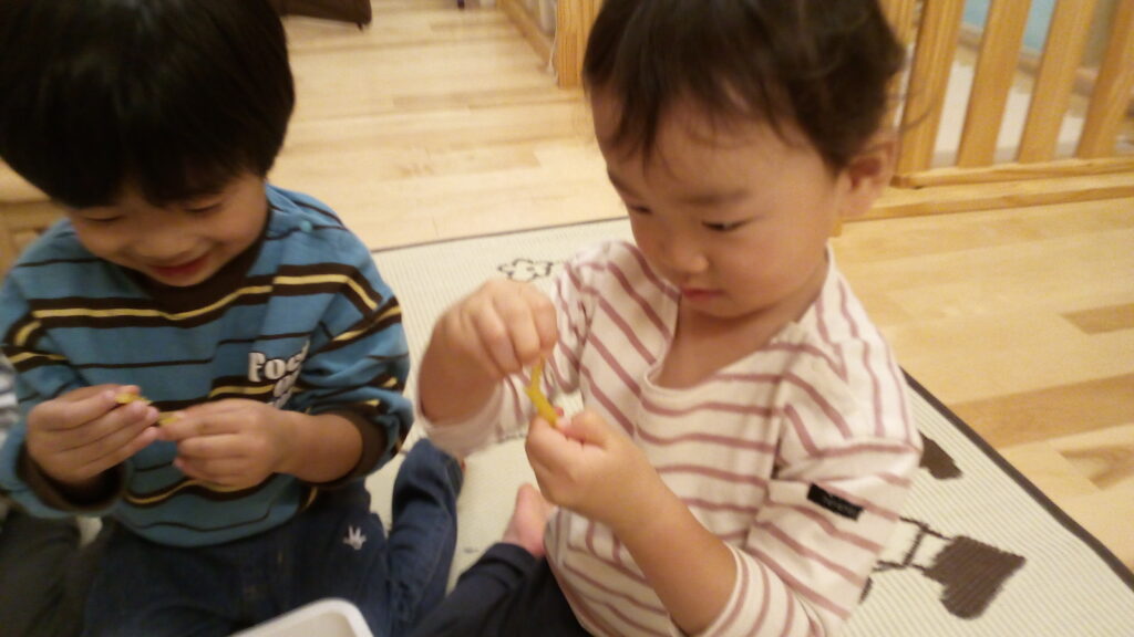 数日後、おやつにきなこマカロニが出てくると、「せんせい!固くないよ!」「すこし大きくなっているよ!」と発見したことを教えてくれました。みんなが今までで一番美味しそうに食べている姿を見て嬉しくなりました。