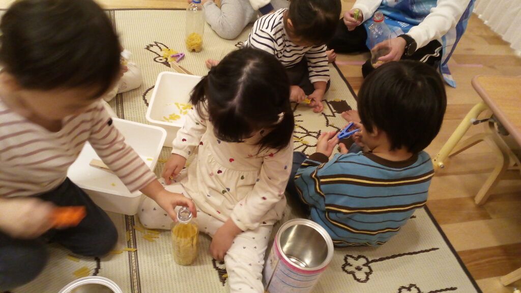 しばらく観察をした後は、缶やペットボトルを出して音の違いを楽しみ、さらにトングや洗濯バサミを出すと、集中してマカロニを掴み好きな容器に移していました。