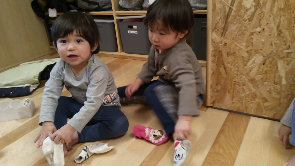 どきどきワクワクの新年度を迎え、ももぐみさんは靴下を自分で履いてみることに挑戦中!