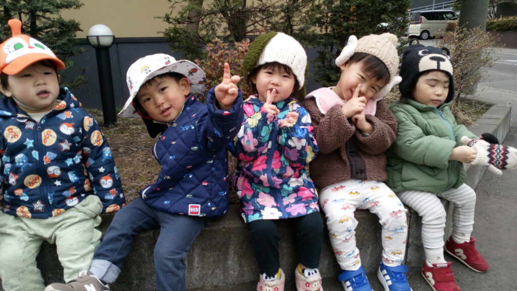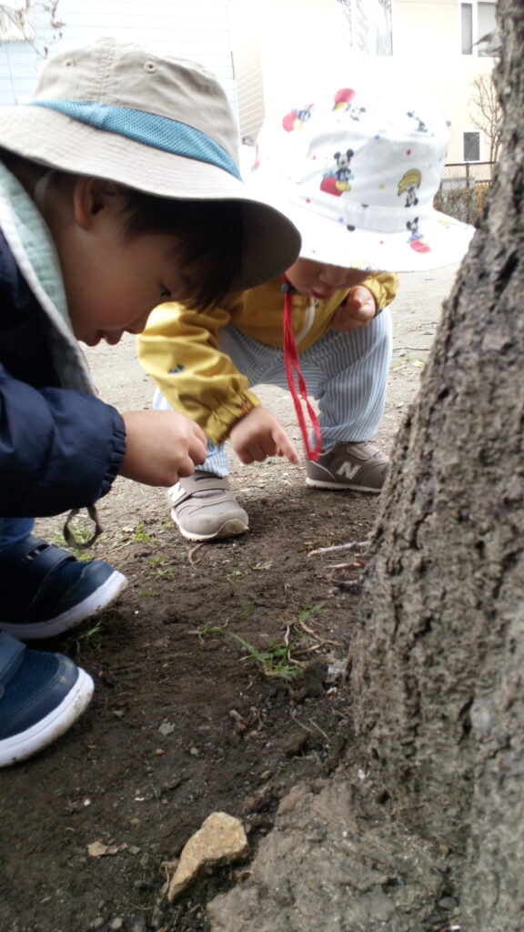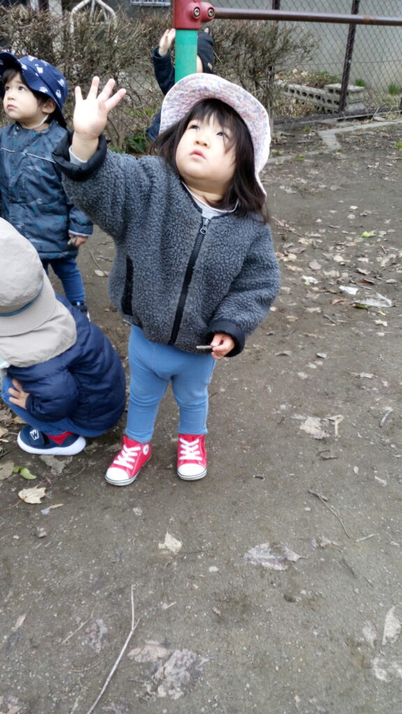 準備ができたらお外に行って、大好きな虫探しやしゃぼん玉あそびなどを楽しんでいます☺お空に飛行機を発見したら、みんなで「ばいば~い✋」と手を振って、かわいらしい姿が見られています☆春の陽気に包まれながら、いろいろな公園に行ってたっぷり身体を動かしあそんでいきたいと思っています!