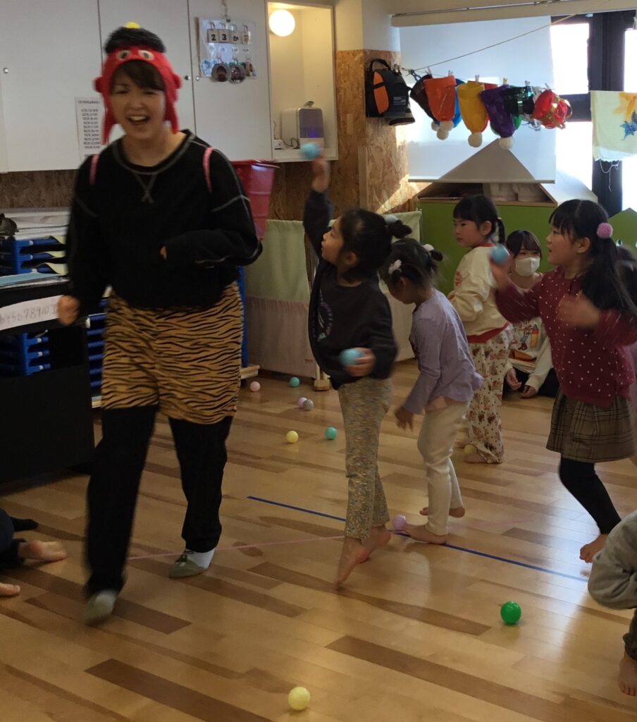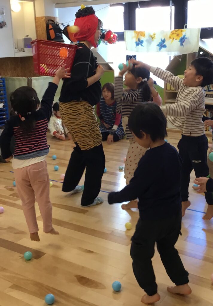 節分の紙芝居の後に、みんなで豆まき(カラーボール投げ)をしました!「おにはそと~ふくはうち~」と言いながら、保育士のかわいい鬼の背中のかごを狙って玉を入れ、心の鬼をやっつけました!!グループにわかれて勝負し、うどんグループは35個、うさぎグループは、なんと45個も入れました☆
