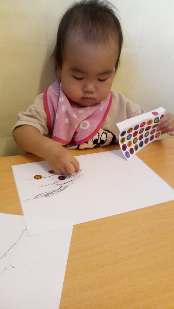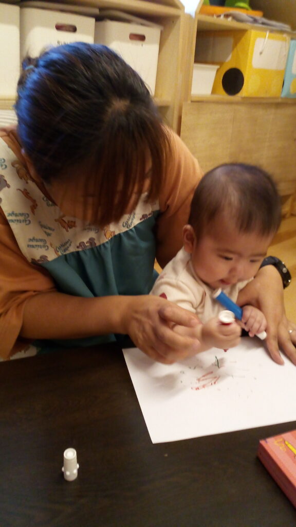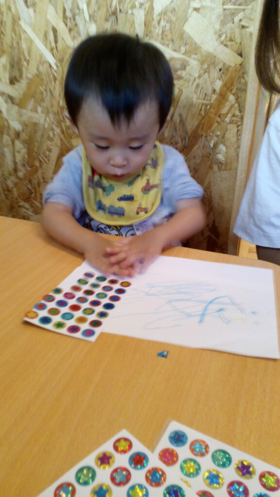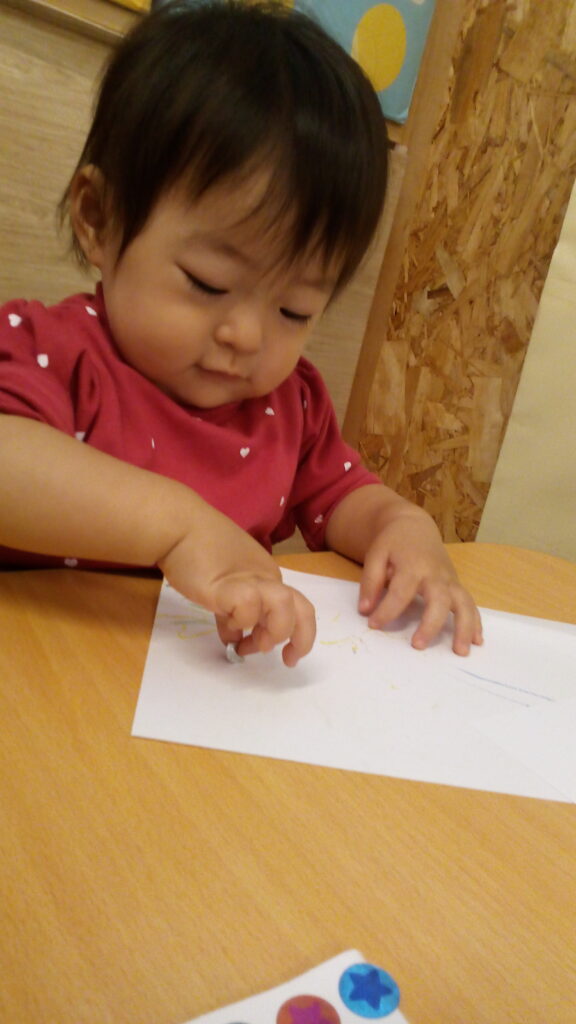 この日はこれから行われる運動会のフラッグ作りをしました。今回は月齢に応じた製作として、高月齢児はクレヨンのなぐりがきとシール貼りをメインに!低月齢児はクレヨンでは筆圧が薄いので、水性ペンを握ってチャレンジです‼一人ひとり思い思いに色を選び、握って感触あそびを楽しみましたよ☆このフラッグは運動会当日に体育館に飾られますよ♬お楽しみに~
