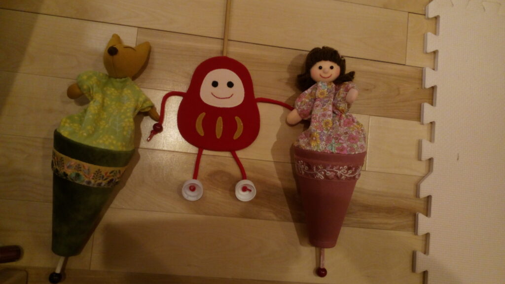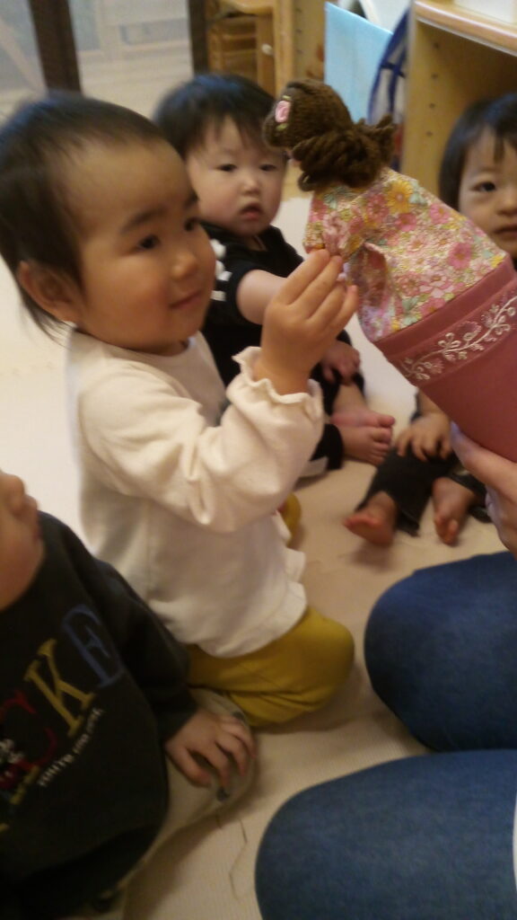 発表会の衣装にも使用したフワフワマスコットのおべんとうバスのキャラクターたちが子どもたちのあそびの一つとなっているいちご組。「ハンバーグくーん」と呼んでは抱っこして愛着を持って可愛がってくれています…。このフワフワの感触がまた安心するのでしょうね。最近では、わらべうたの講師の先生からいただいたこのかくれんぼのお人形が今クラスでブームとなっています‼一緒にいないないばぁをしたり、ブロックをお菓子に見立てて食べさせてくれたり、このフワフワの感触の心地よさを感じて楽しんでいますよ♪