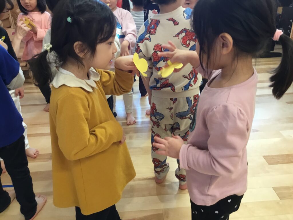 「コンコンさんあそびましょ」では、まるくなって真ん中の鬼は「今、ねてます」「今、ご飯食べています」などのやりとりも楽しみながら答えていましたよ♪最後は「なんのおかずで?」とみんなに聞かれ、「へびのいきたん」と言ってすぐに近くの友だちをタッチしていました!また、ちょうちょのわらべうたでは、「ひらひらひらひらとんでって~」と歌いながらちょうちょを指につけて歩き、友だちと挨拶したり、さようならをしてまた他の友だちと出会ったりも楽しみました☆来月のわらべうたも楽しみな子どもたちでした♪